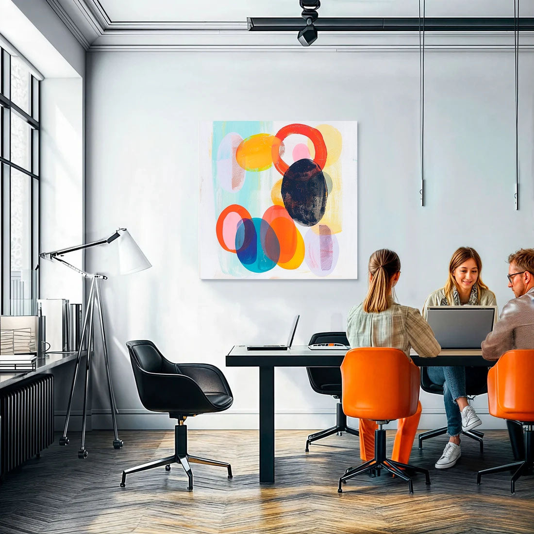 Cuadro abstracto con formas ovaladas en colores vibrantes como turquesa, rosa, naranja y azul, sobre un fondo blanco. Su diseño moderno y colorido lo hace perfecto para añadir un toque de frescura a cualquier espacio. Ideal para campañas de decoración.