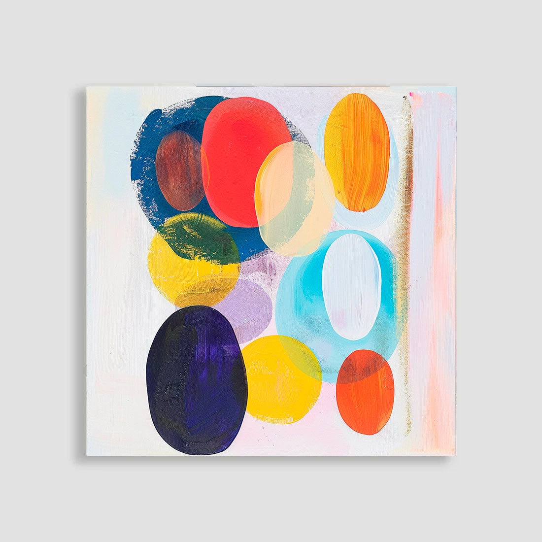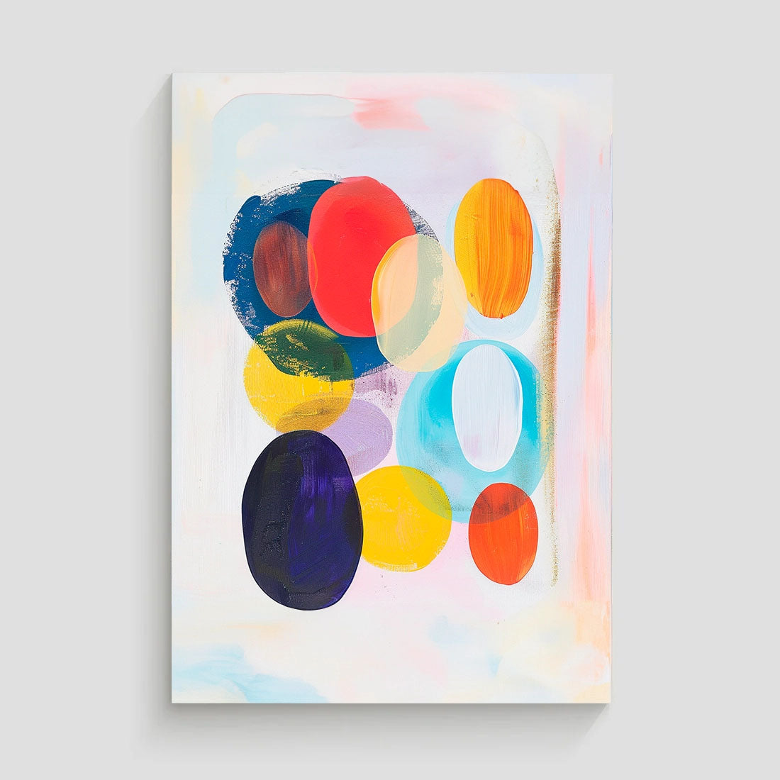 Cuadro abstracto con formas ovaladas en colores vibrantes como turquesa, rosa, naranja y rojo, sobre un fondo blanco. Su diseño moderno y colorido lo hace perfecto para añadir un toque de frescura a cualquier espacio. Ideal para campañas de decoración.